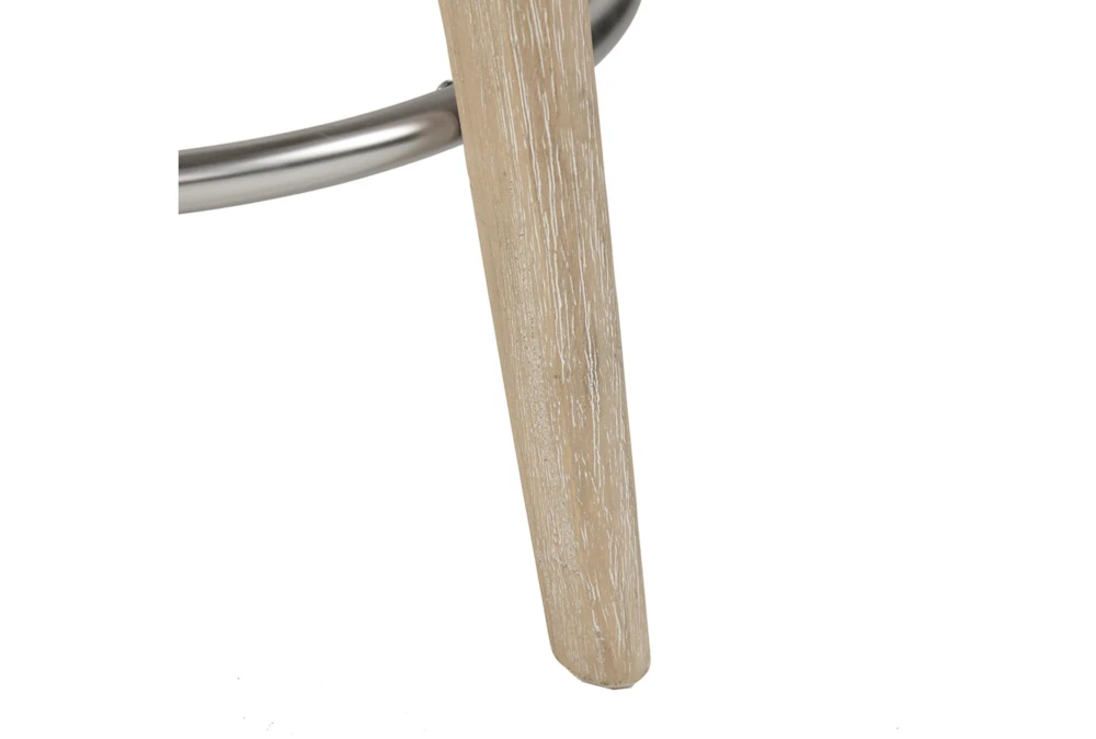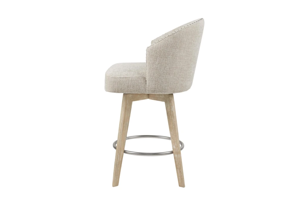 The Alessia 26″ Swivel Counter Stool is a traditional style stool made of rubber wood legs and upholstered seat and back in cream-colored 100% polyester fabric with a silver kickplate and foam cushion fill, perfect for any dining room. Assembly is required.