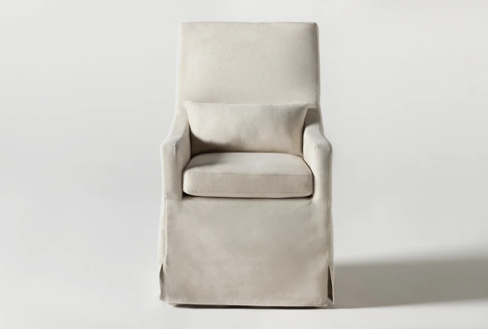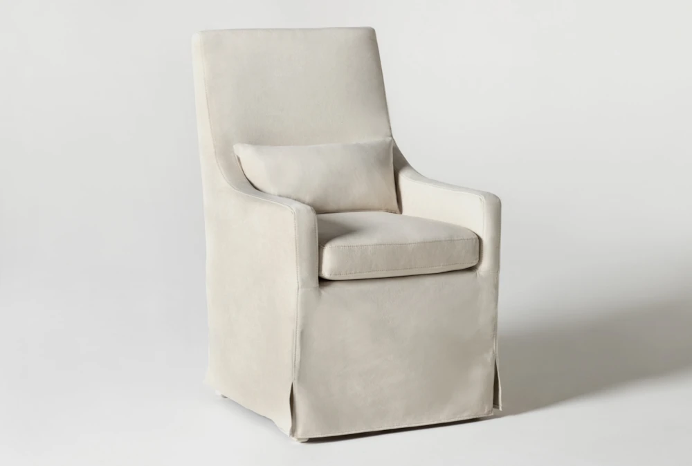 Coming to a dining room near you: our casually elegant Broadway arm chair. The classic slipcovered design migrates from the living room, so you can enjoy this relaxed yet tailored favorite during breakfast, lunch and dinner. It even includes a lumbar pillow for comfortable back support.