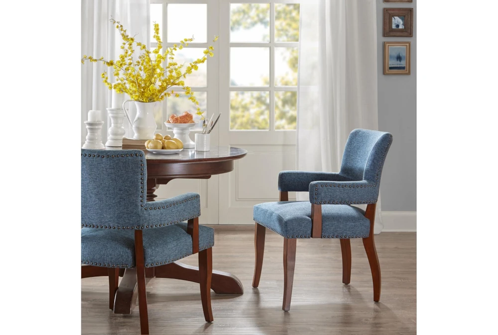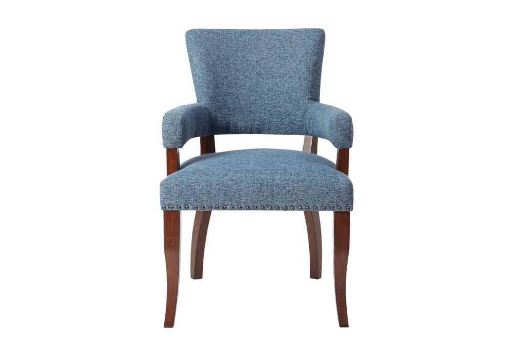 The Calloway Blue Arm Dining Chair is a stylish and traditional addition to any dining room. Made of high-quality wood, this chair features arms for added comfort and support.