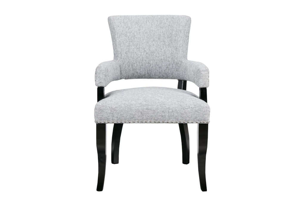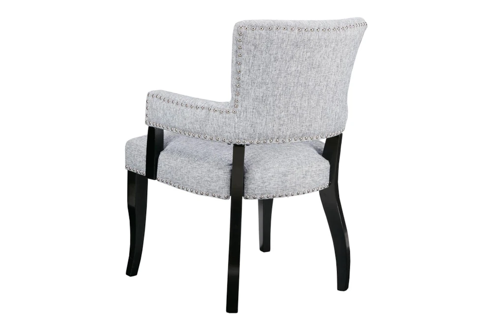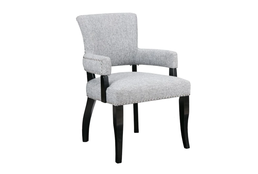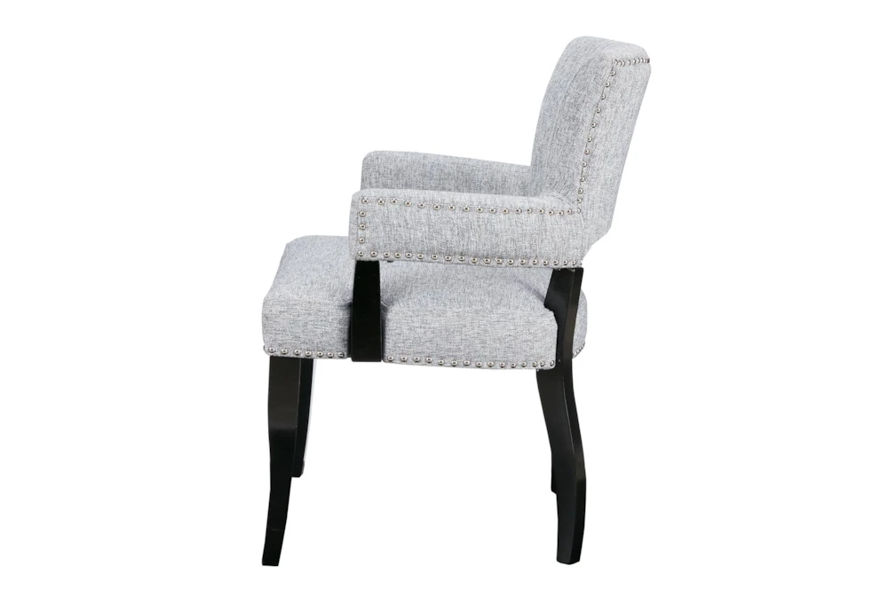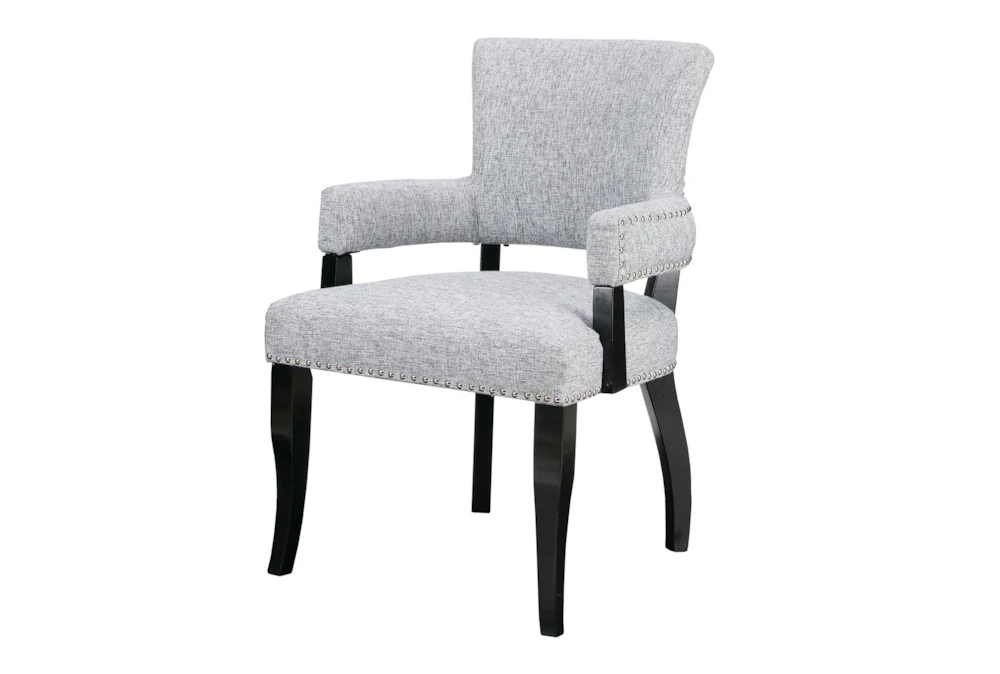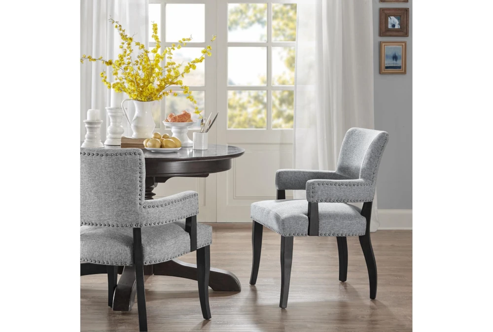 The Calloway Grey Arm Dining Chair is a traditional-style wood chair with arms, perfect for the dining room. Assembly is required and the chair features a grey rubberwood frame, 84% polyester/16% acrylic fabric, high density foam filling, black noir wood finish, and silver nailheads.