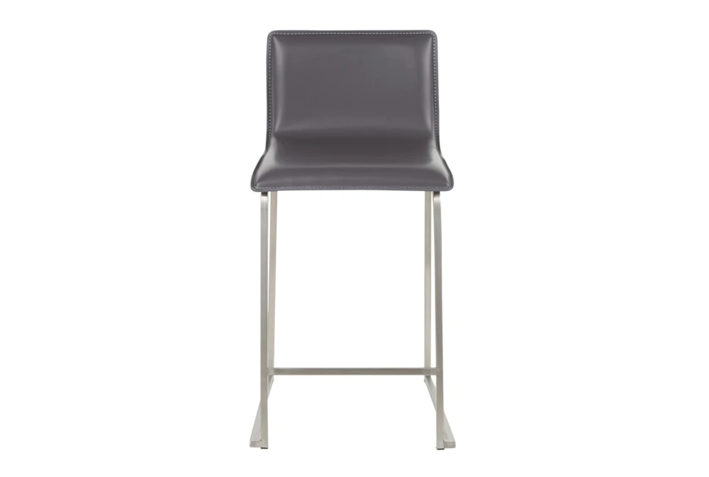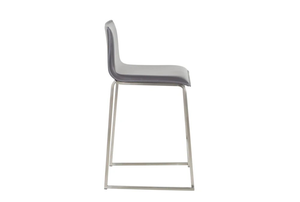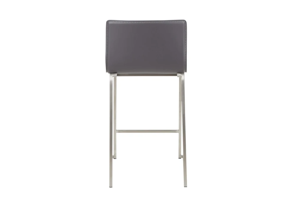 Elevate your dining experience with the Cara Brushed Stainless and Grey Faux Leather Counter Stool Set of 2, boasting a modern style and armless design. Crafted from durable faux leather and standing tall, this set is perfect for any dining room.