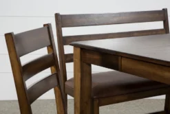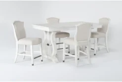 The Claremont Ash Counter Set With Bench is a 6-piece set made of rustic wood and beige fabric, perfect for any dining room. The set includes a tall counter table with a bench, all made of durable ash and acacia solids for long-lasting use.