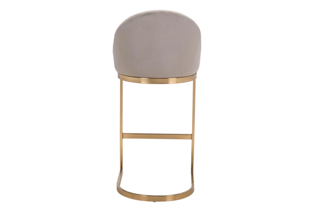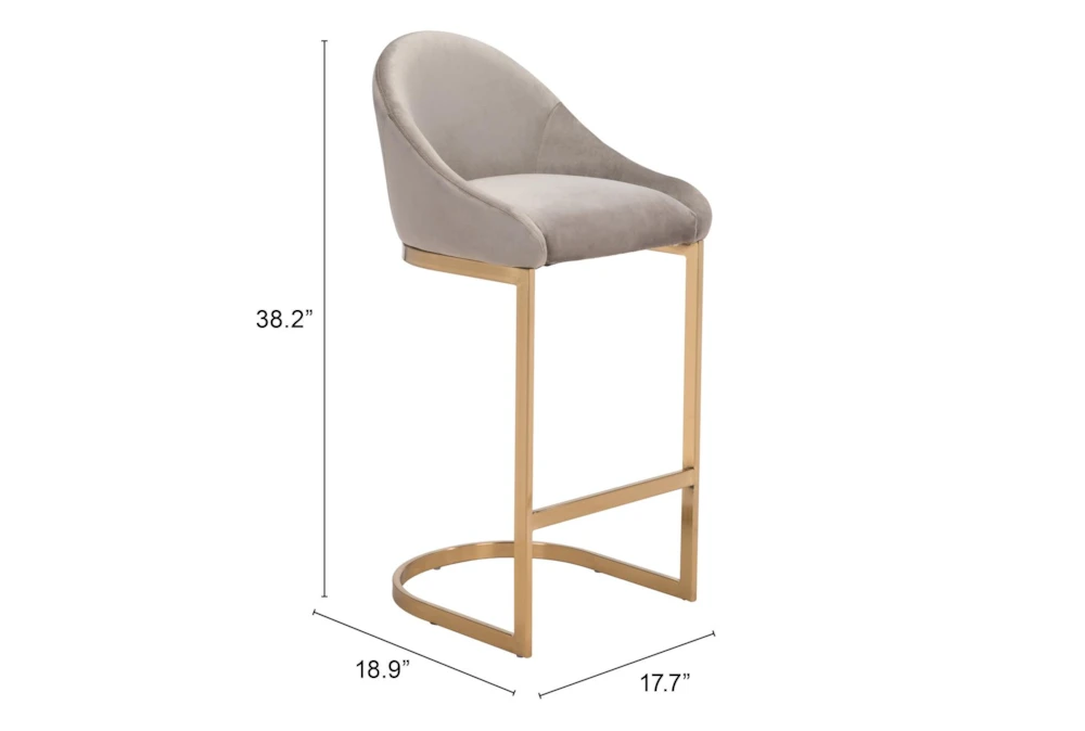 This contemporary grey with gold bar stool is an armless, curved, and backrest-equipped seating option made from steel, plywood, foam, and 100% polyurethane, with gray and gold accents. Assembly is required for this stylish addition to any dining room, with a seating capacity of one and no hanging method required.