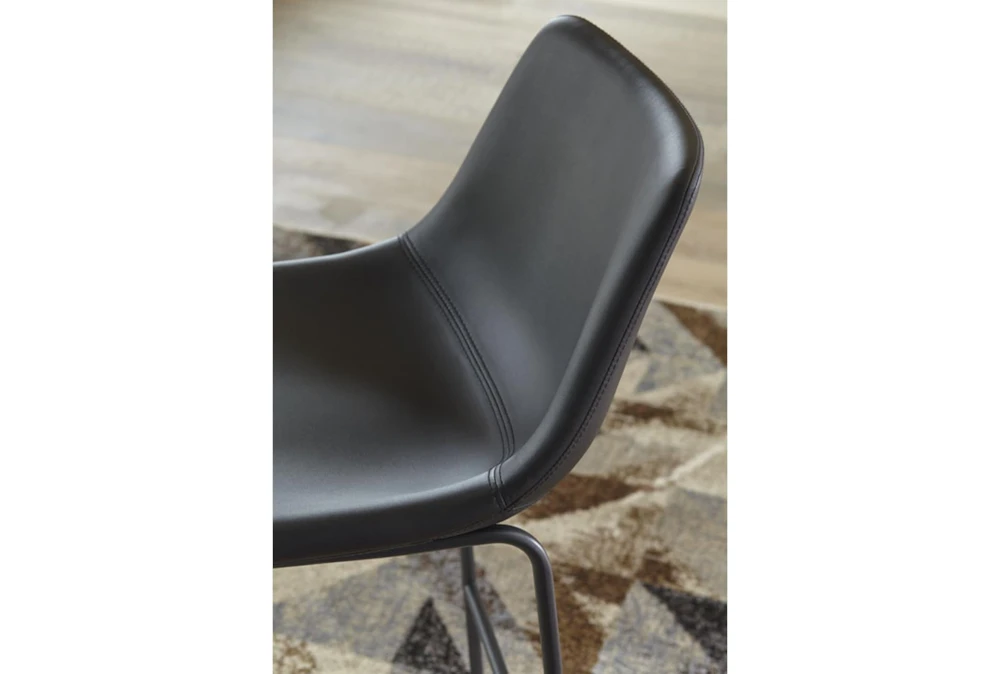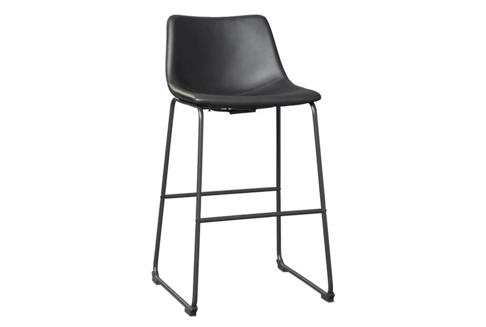 The Edison Black 29 Inch Bar Stool Set Of 2 is a modern addition to any dining room, featuring armless design, a comfortable cushioned seat, and sturdy metal and faux leather construction. Assembly is required for these sleek black stools with a chic faux leather bucket seat and supportive backrest.
