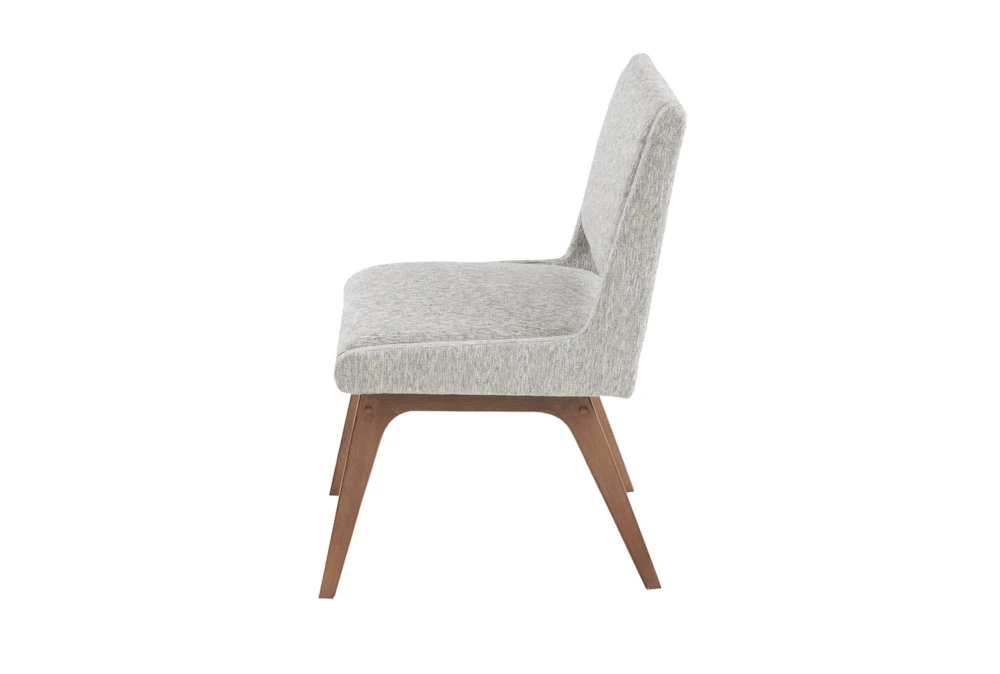The Ellison Grey Dining Side Chair Set of 2 features a modern style with a fabric upholstery and rubber solid wood legs, and requires assembly. The chairs are a light grey color with a pecan wood finish and upholstered seat and back made from 100% polyester fabric and foam filling.