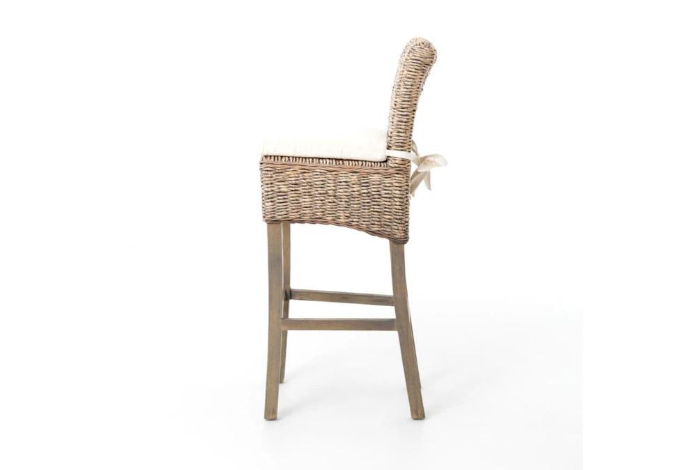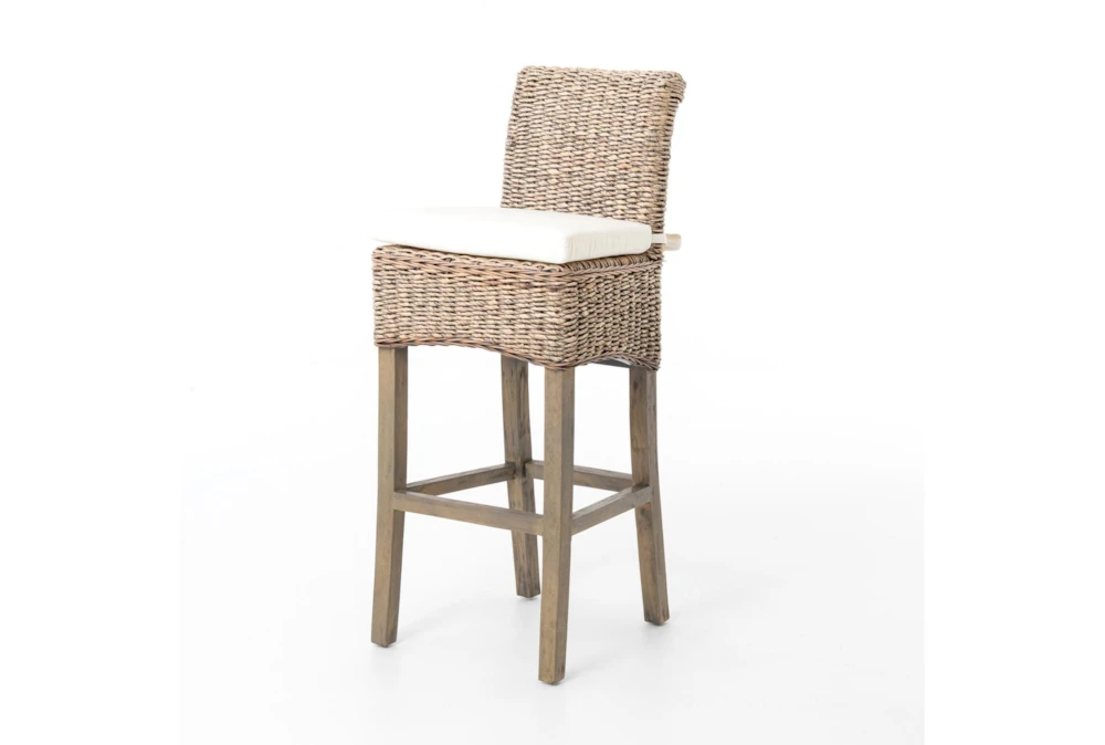 This Grey Banana Leaf Counter Stool comes with a cushion and features a casual style. The stool is made of 100% cotton with solid mahogany and banana leaf accents, and has a grey wash finish.