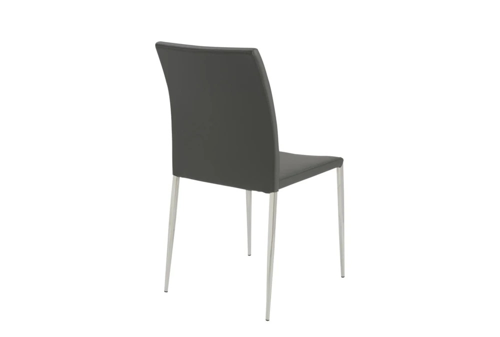 This set of two contemporary style side chairs features a grey faux leather and stainless steel construction that is perfect for any dining room. The chairs are stackable for easy storage and feature a sleek leatherette design.