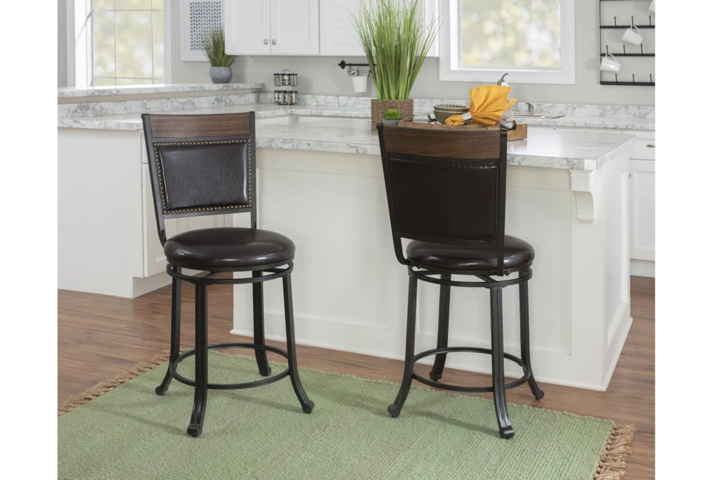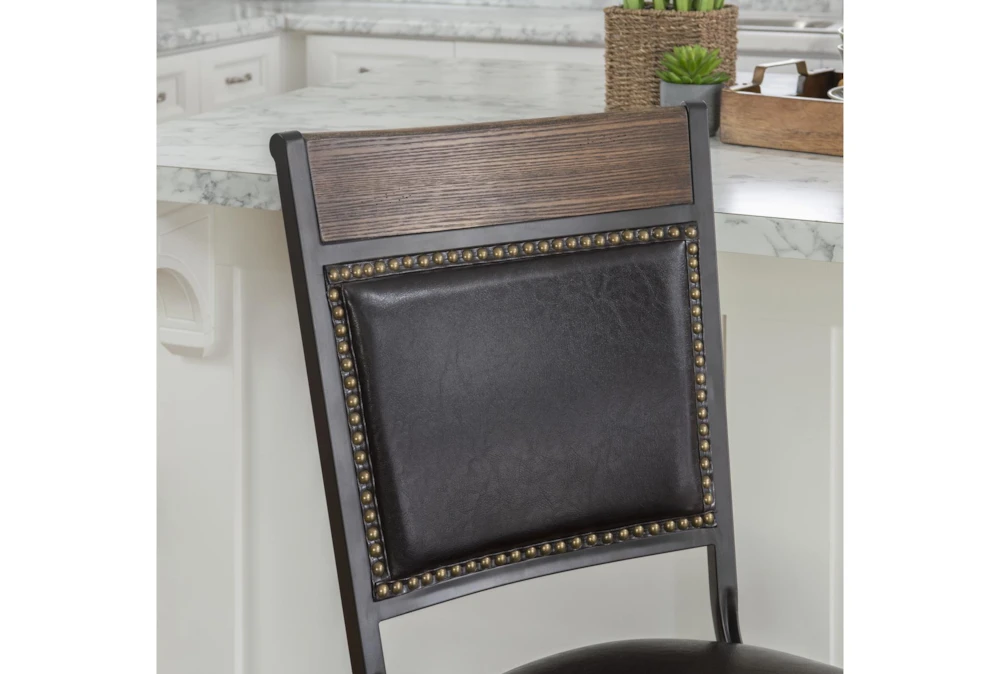 The Hamilton Brown Counter Stool is a traditional-style stool made of wood with nailhead detailing, a tall back, and armless design. It features a secondary material of metal and faux leather, and is perfect for use in a dining room setting. Assembly is required and it is made of plywood, metal, foam, PU, and rubberwood.