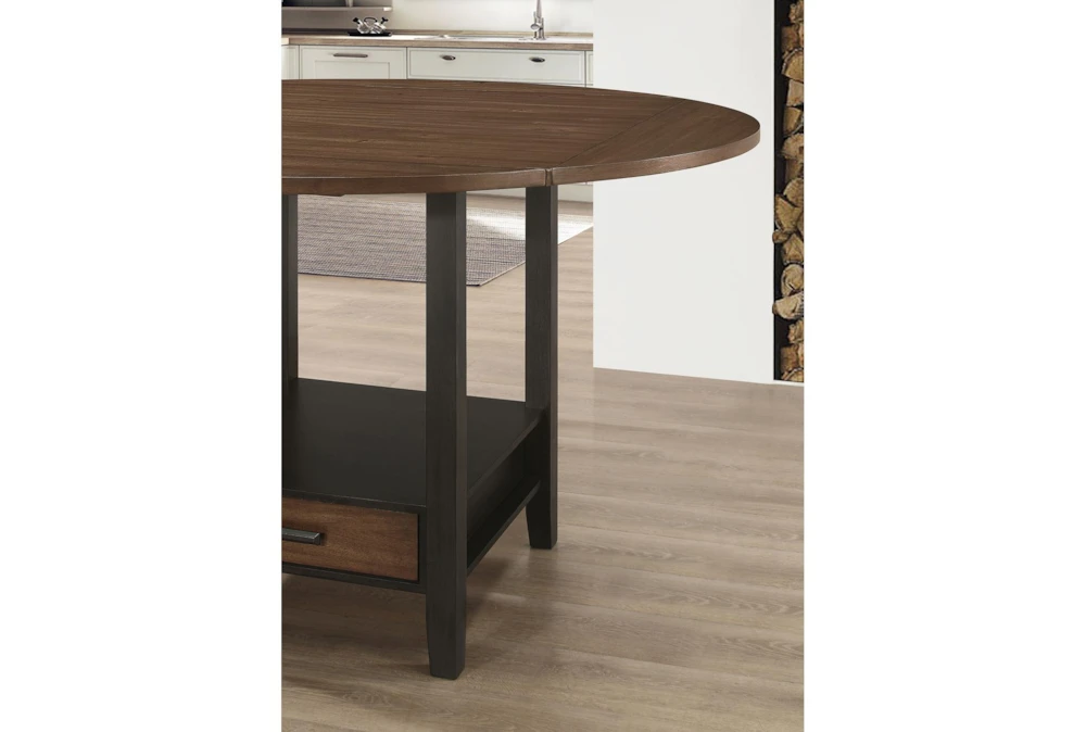 The Jarvis Round Drop Leaf Counter Table is a stylish and functional addition to any dining room. Featuring storage drawers and shelves, this casual counter height table is made of durable Asian hardwood and comes in a warm cinnamon or espresso finish.