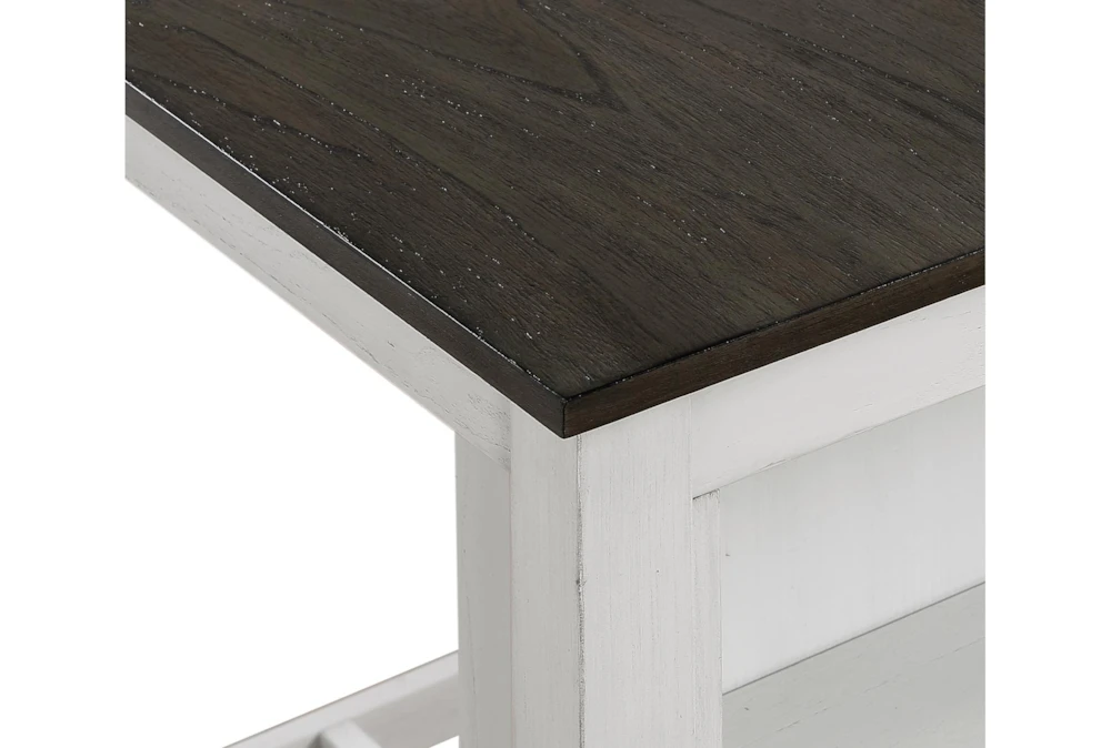 The Kaine Two Tone White Storage Counter Set For 2 is a casual yet stylish addition to any dining room, boasting tall armless chairs with shelves and a 3-piece design made from quality wood. Perfect for those who value both form and function, this set also includes convenient storage options for added utility.