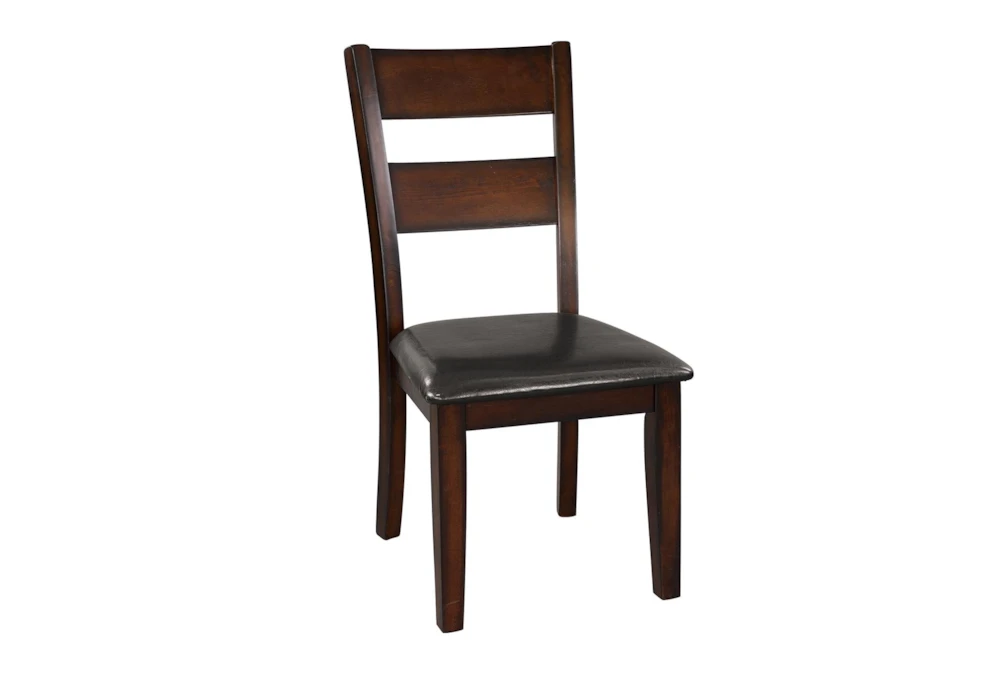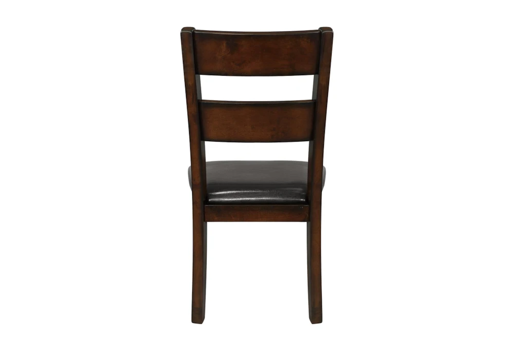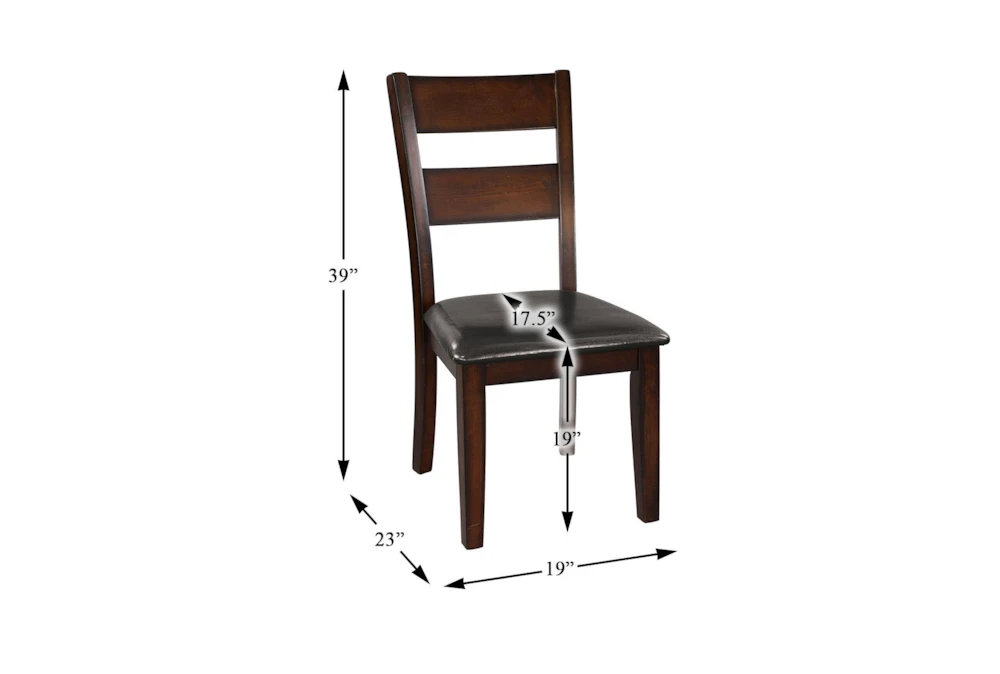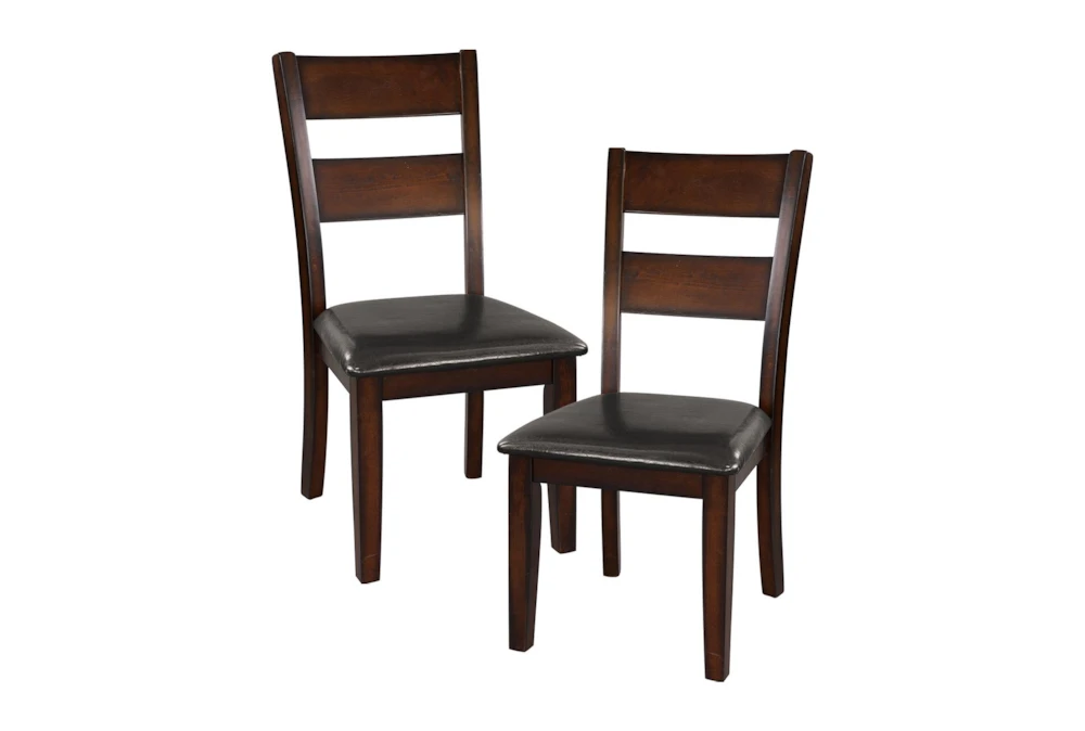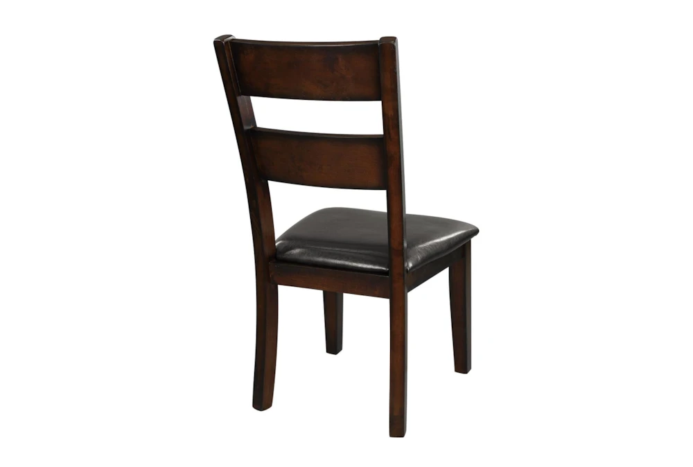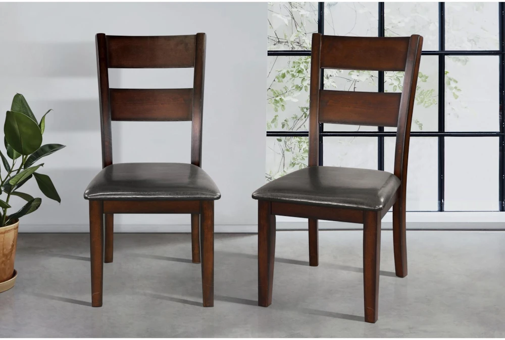 The Kian Dark Brown Dining Chair Set Of 2 features a rustic style made from solid wood and faux leather with cushion and back support. Assembly is required and the chairs come in a set of 2 with tapered legs and a cherry finish.
