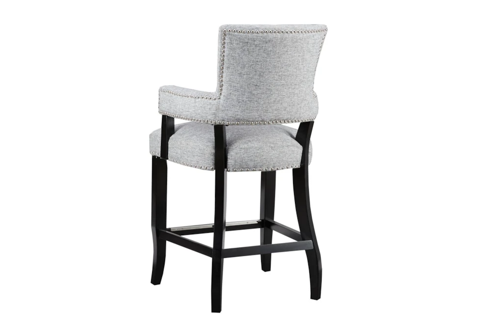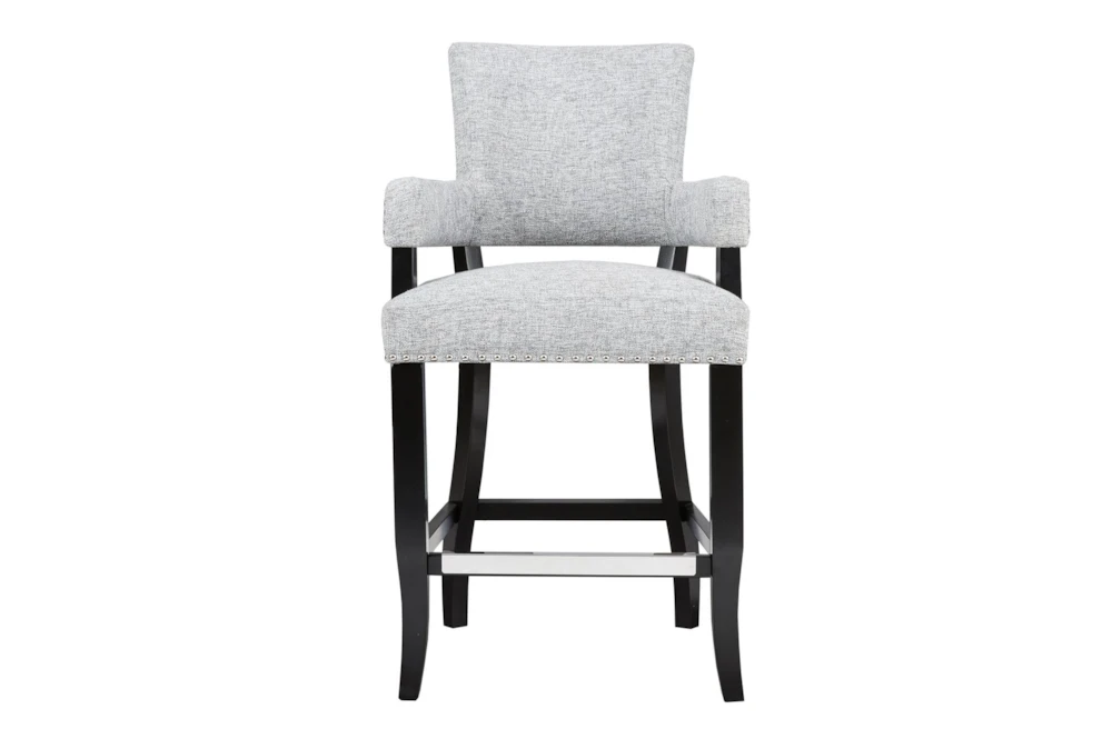 The Lincoln Grey 26″ Counter Stool is a casual style stool made of fabric and wood with nailhead accents, tall height, armrests, and a cushioned seat. Assembly is required and the stool features a black noir wood finish and silver kickplate.