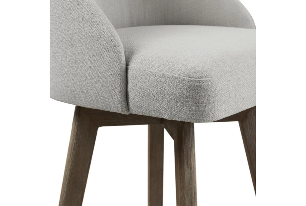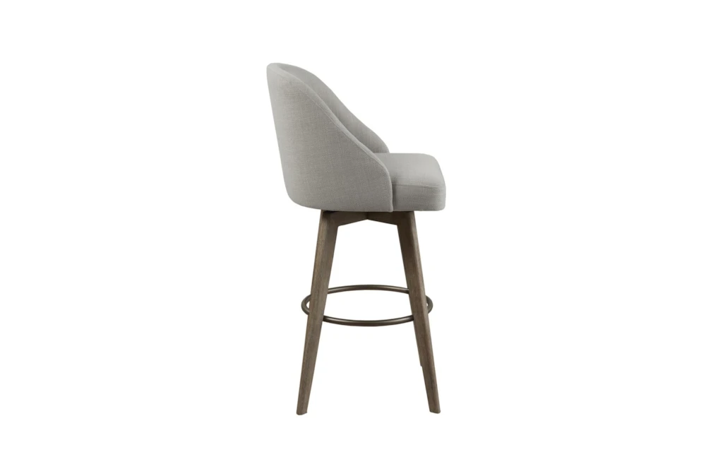 The Marshall Grey Bar Stool with Swivel Seat is a modern style stool made of solid wood and plywood frame, upholstered seat and back, and a matt silver metal ring footrest. Assembly is required, and the stool features sinuous springs for seat construction, a foam cushion and back fill material, and a 92% polyester and 8% linen fabric composition.