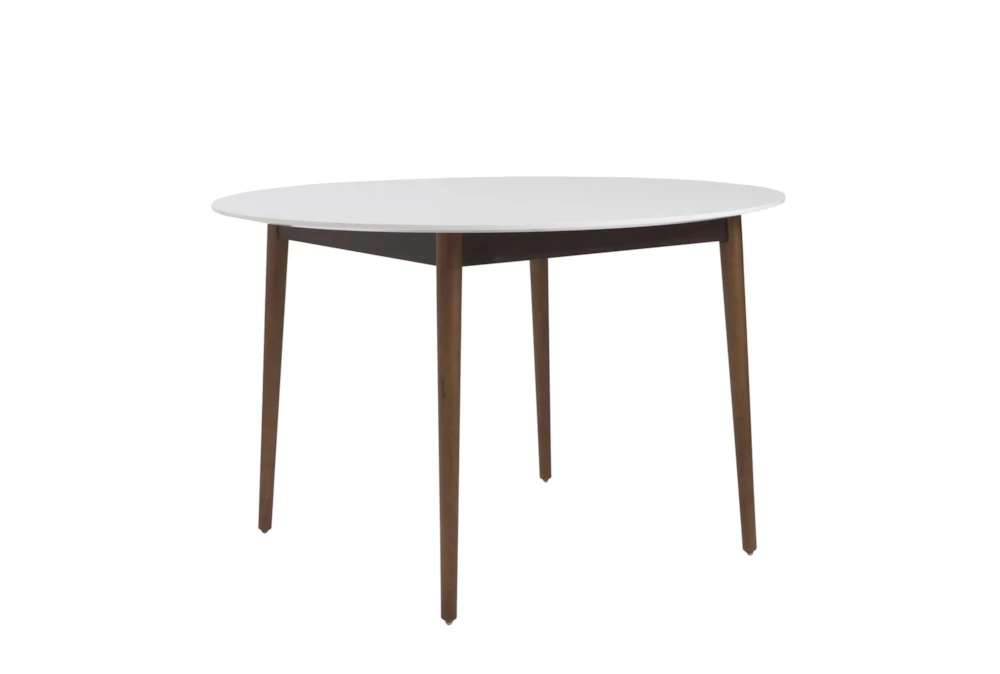 The Newport White 47 Inch Round Dining Table With Dark Walnut Base is a modern-style table made of lacquered MDF wood, designed specifically for dining rooms. Assembly is required to set up this white table with a dark walnut base.