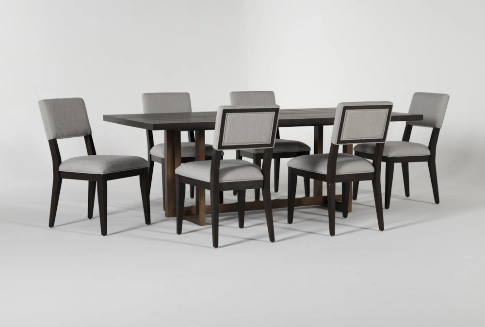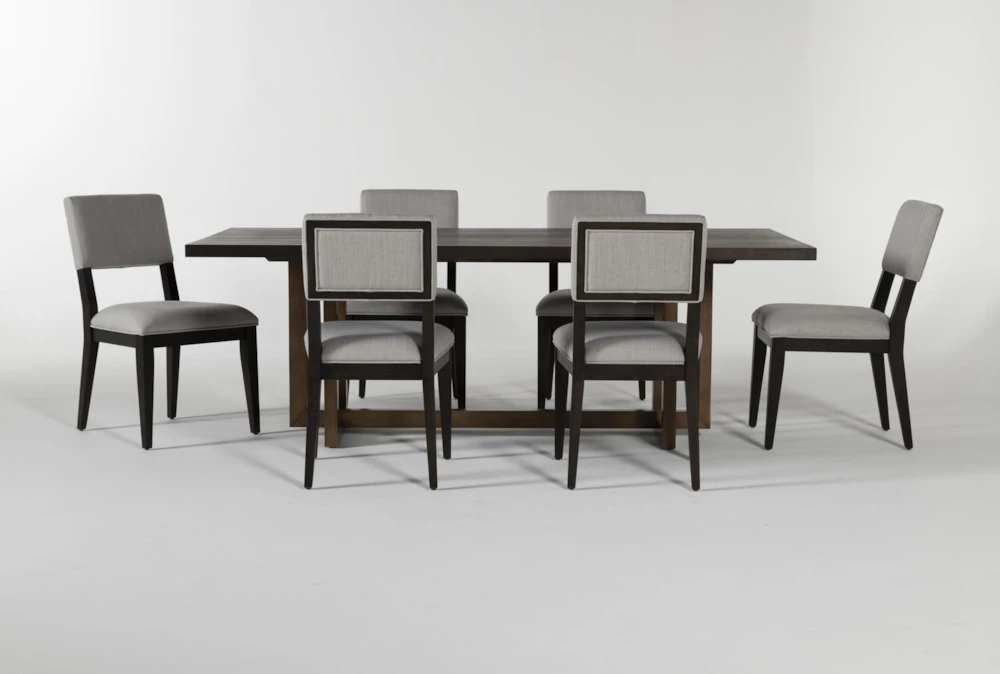 Bringing new meaning to clean living, our Pierce Black dining set lends airy, streamlined style to every meal. Sleek, minimalist profiles distinguish the designs, which feature sturdy hardwood and oak construction in a rich umber finish. While the table dazzles with its strikingly architectural base that is painted bronze for a metal look, the chair supports and comforts with an upholstered back and seat.