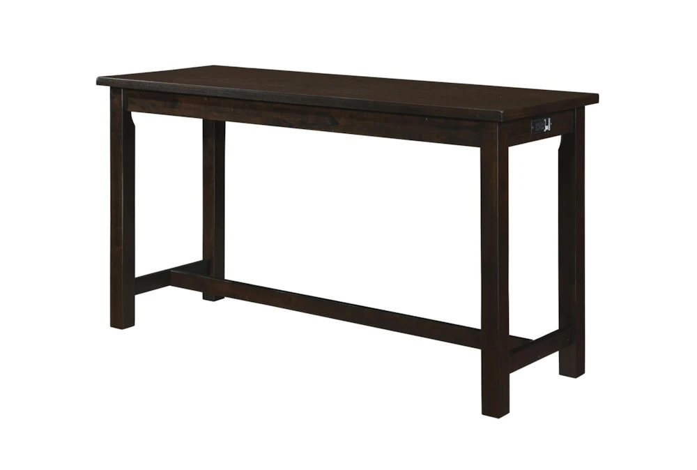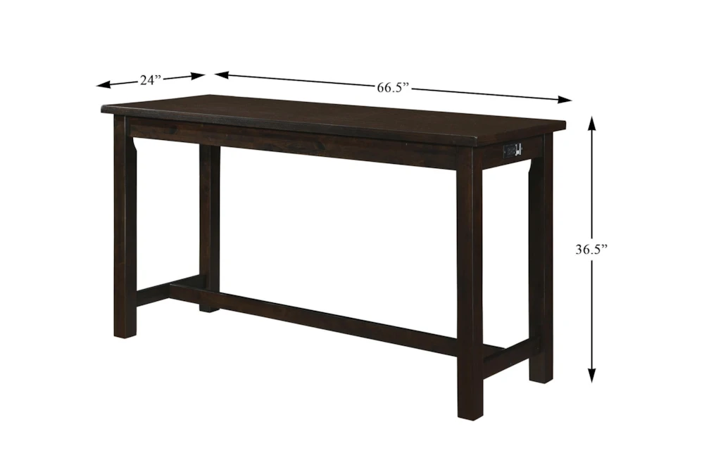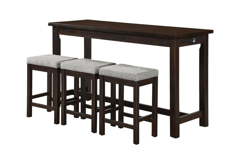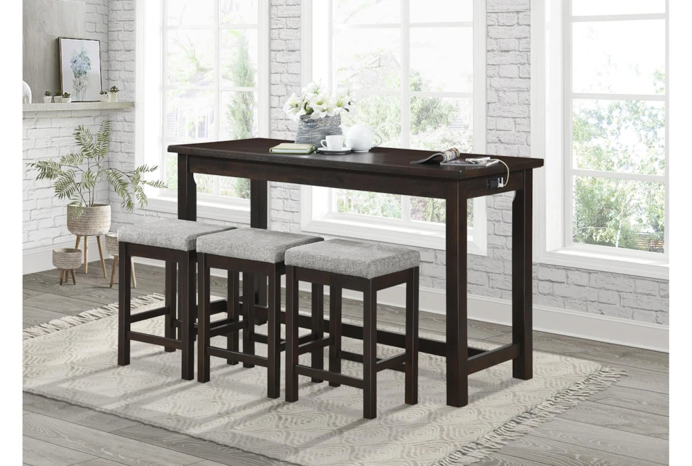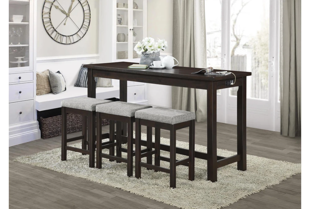 The Stacy Brown Counter Set For 3 is a casual dining room set made with wood and dolomite materials, featuring a counter height design with built-in USB charging ports and power outlets, a tall table with storage and drawers, and a set of 3 stools with ball bearing glides. Assembly is required and the set comes in an espresso color made from engineered wood, fabric, foam, and Asian hardwood.