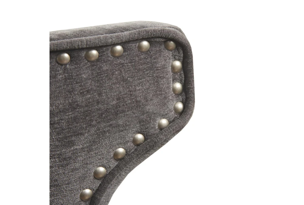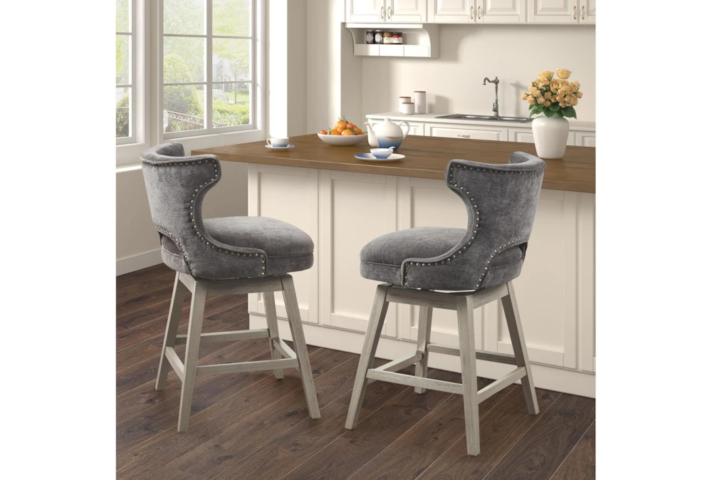The Walsh Charcoal Swivel Counter Stool features a tall, armless design with nailhead detailing and a swivel seat for added convenience. This traditional style stool is made with a solid wood and plywood frame, solid wood legs, and upholstered seat and back, with a metal kickplate on the stretcher.